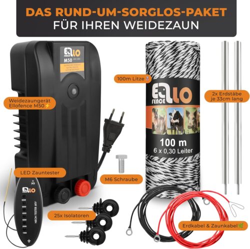 Unser Ellofence M50 ist ein vielseitiges solides Weidezaungerät. Mit einer Entladeenergie von 0,30 Joule und einer maximalen Spannung von 8.600 Volt bietet es Ihnen den perfekten Schutz für Ihre Haustiere, egal ob Hund, Katze oder Pferd. Es hält außerdem ungeliebte Besucher wie Hase, Kaninchen, Fuchs und Fischotter von Ihrem Grundstück fern.
